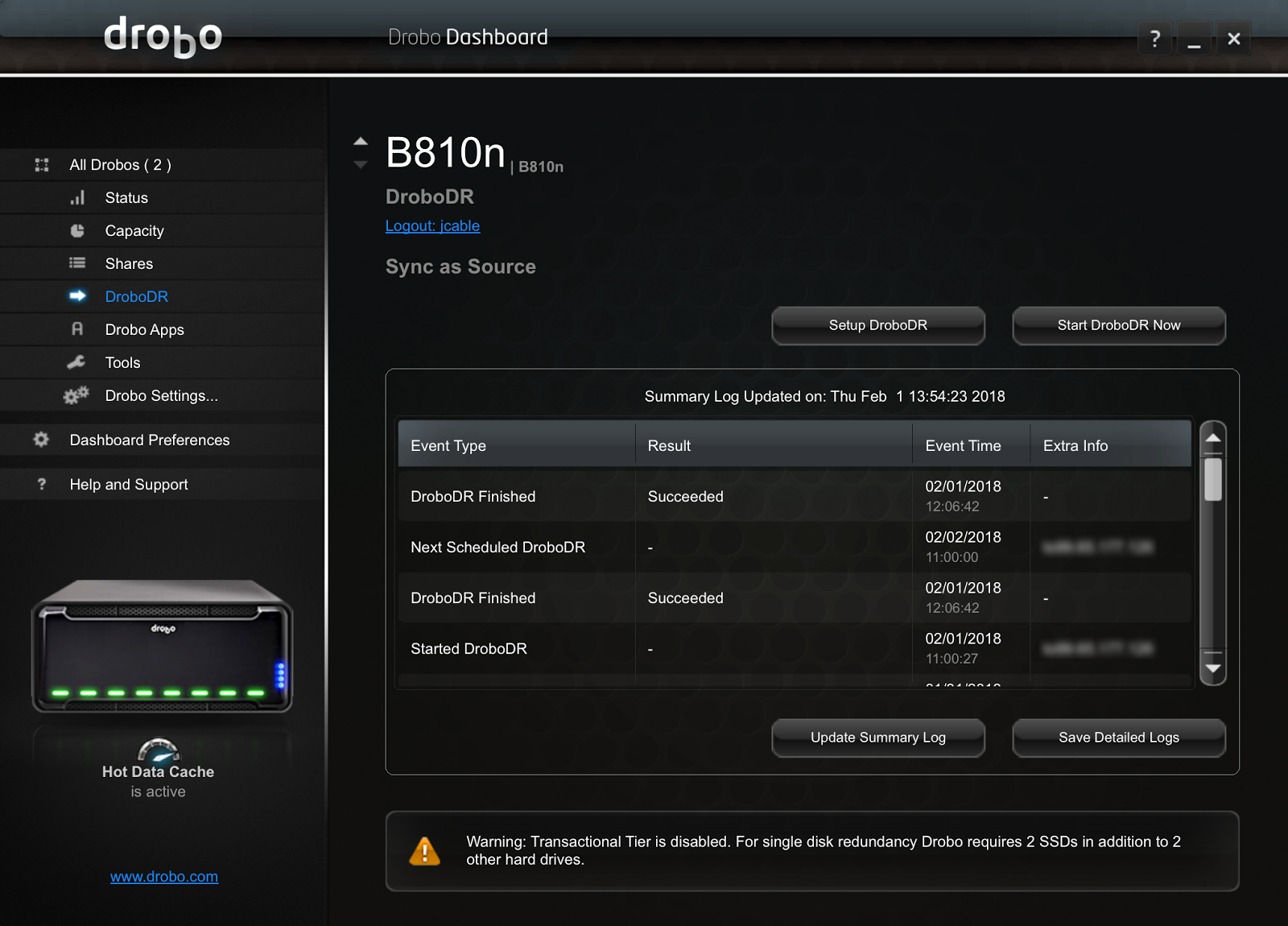 About 6 months ago, I got a second Drobo 810n. At this point, you might be wondering why I would want two of these units. Well...I wanted complete redundancy and I wanted it offsite. I copied all the files from my first 810n to the second unit, which is every digital image I have ever taken! I then took the second 810n to a friends house and connected it to their home router. I set up DroboDR (free software that comes with the 810n) on both units and now they synchronize every night starting at 11pm.