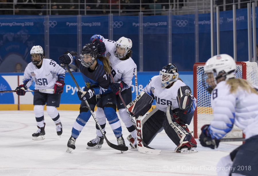 I usually ask to for a photo position on the side where USA shoots twice. This gives me the middle period to get shots of the goalie in action.