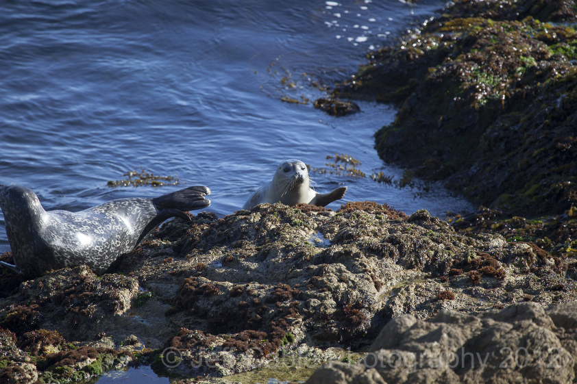 After switching lenses and zooming in much further, I noticed the baby seal trying to make his way up the rocks to join the others. I think he was waving at me in this shot. :)