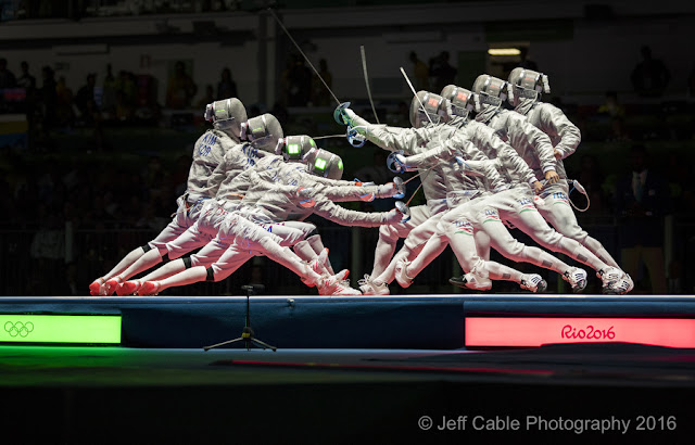 OK - now to the multiple exposure mode. In the blog post I wrote 3 weeks ago, I talked about some of the photos I wanted to capture in Rio. One of them was this shot. I love that the newer cameras can combine multiple exposures in the same frame, but it can not be used in many situations. It generally works better in dark environments, and with minimal distractions in the background. Perfect for fencing. So I have envisioned this shot for way too long. Time to get it.